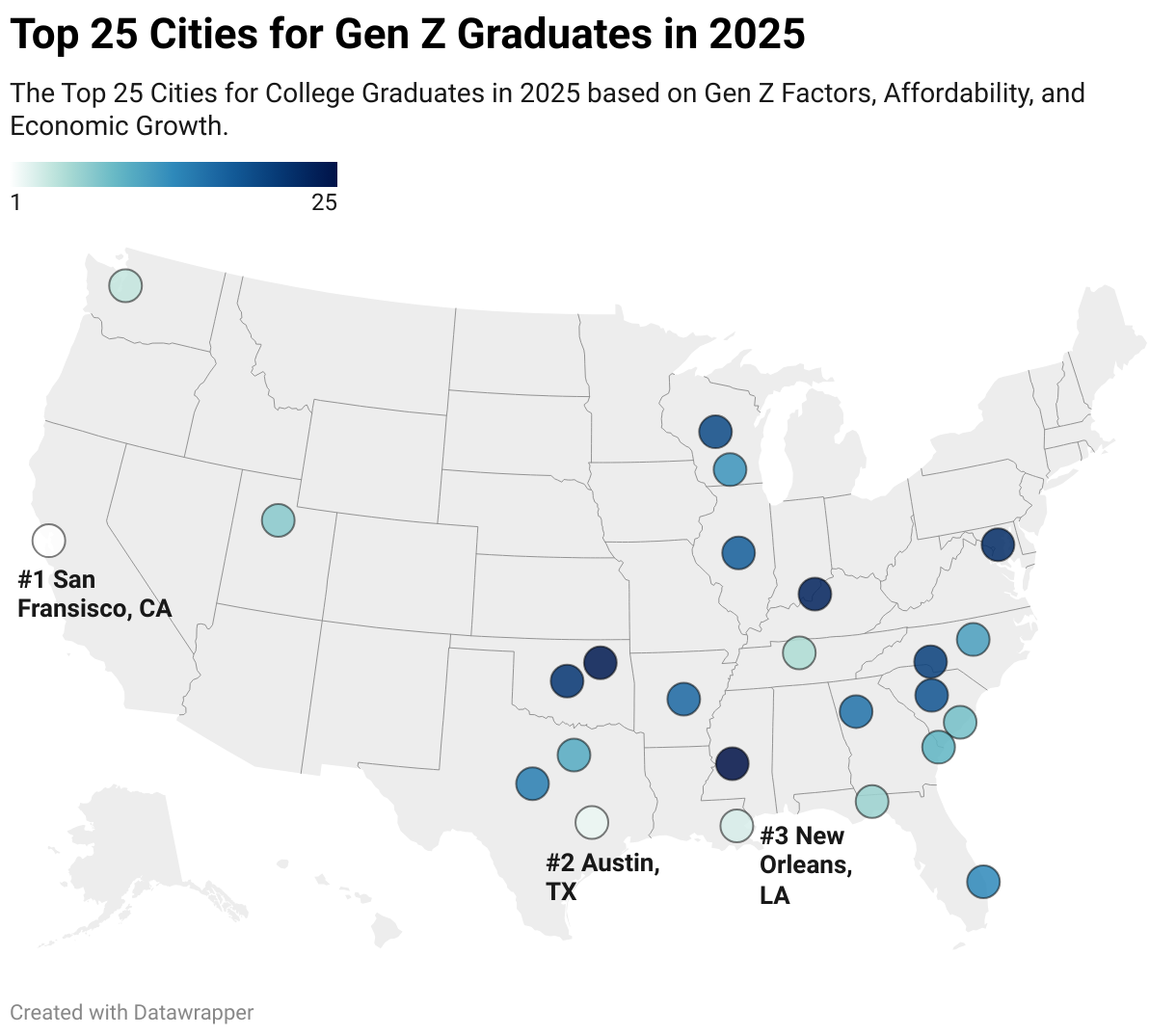 The Top 25 Cities for College Graduates in 2025 based on Gen Z Factors, Affordability, and Economic Growth.