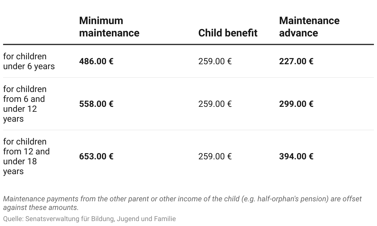 Maintenance payments from the other parent or other income of the child (e.g. half-orphan's pension) are offset against these amounts.