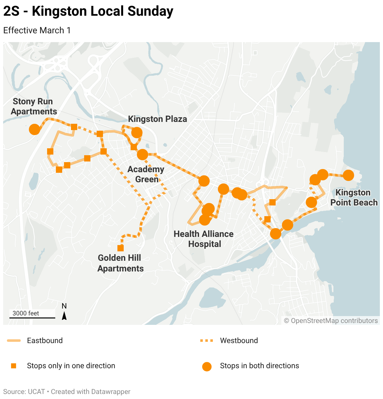 Map of the UCAT Kingston Local Sunday service, running east - west across Kingston from Stony Run Apartments on Hurley Ave to Kingston Point along Broadway Corridor.