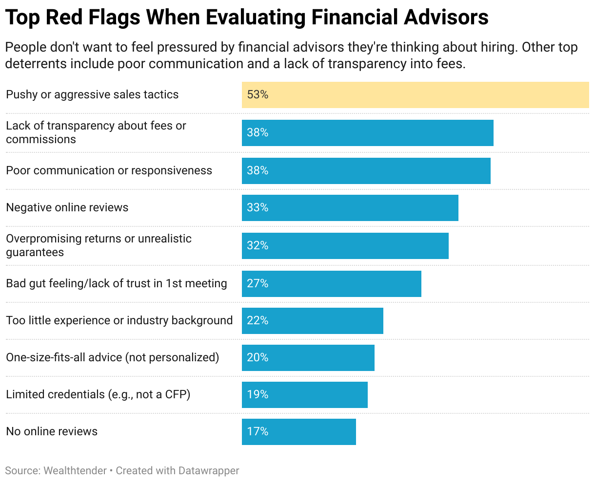 People don't want to feel pressured by financial advisors they're thinking about hiring. Other top deterrents include poor communication and a lack of transparency into fees.
