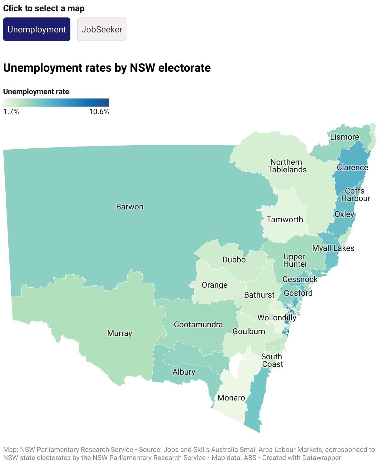 Click to select a map Unemployment JobSeeker Unemployment rates by NSW electorate