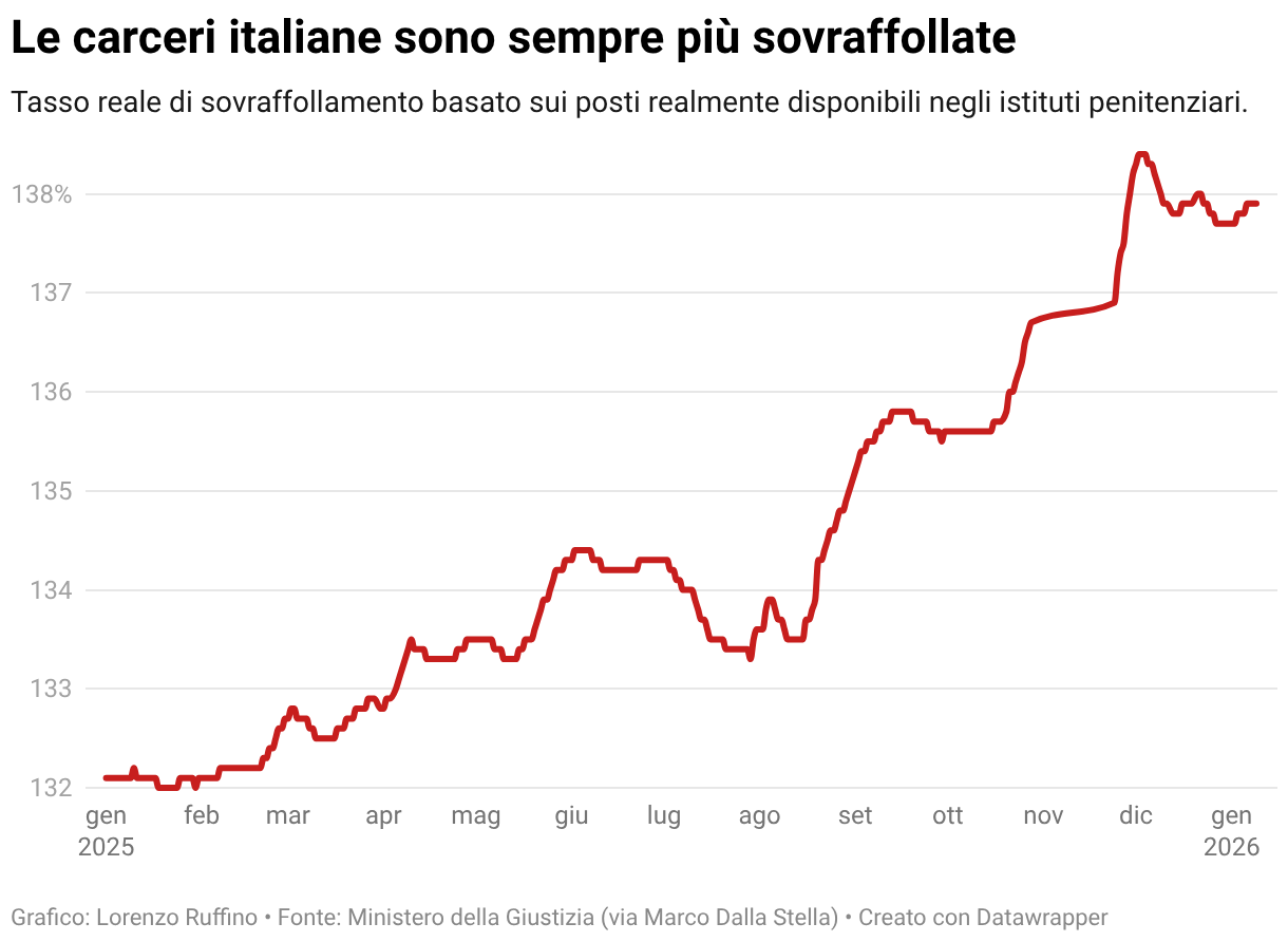 Tasso reale di sovraffollamento basato sui posti realmente disponibili negli istituti penitenziari.