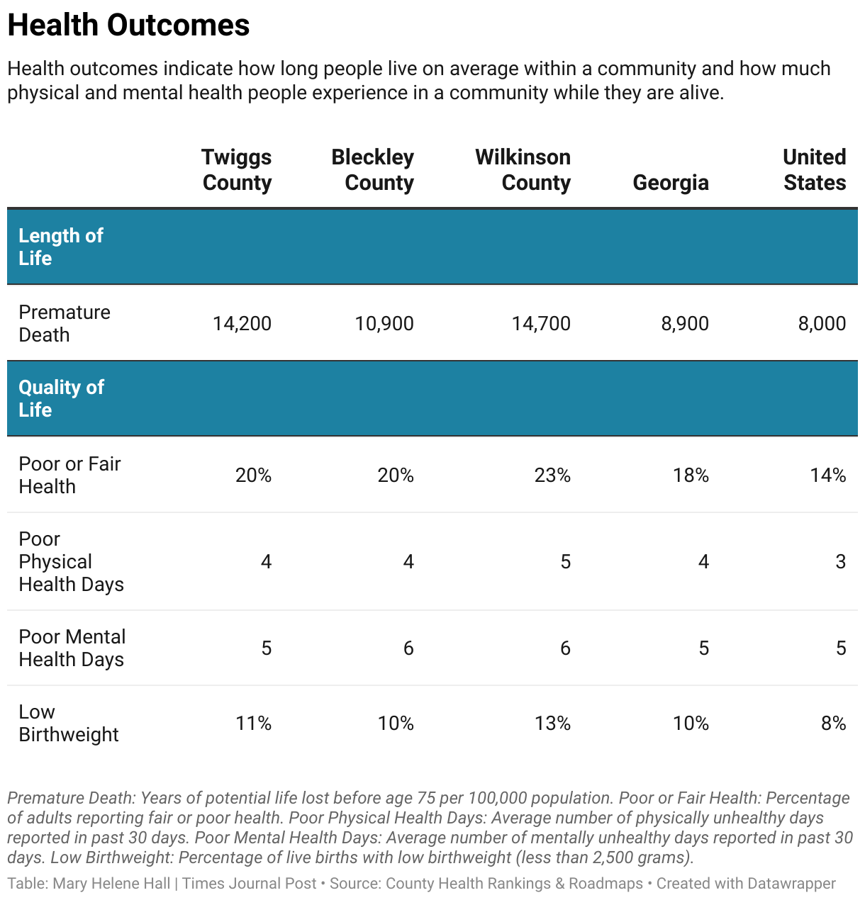 Health outcomes indicate how long people live on average within a community and how much physical and mental health people experience in a community while they are alive.
