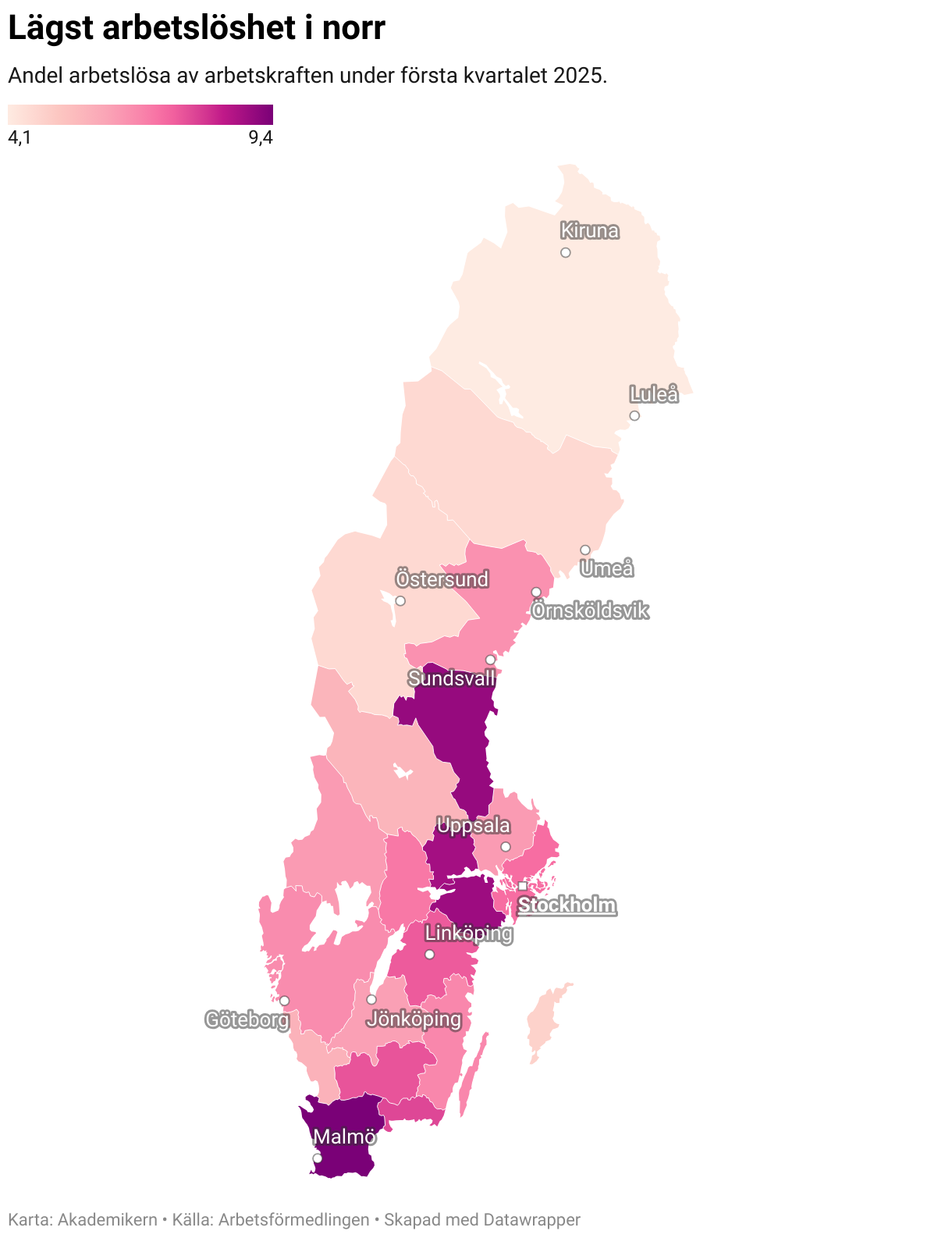 Andel arbetslösa av arbetskraften under första kvartalet 2025.