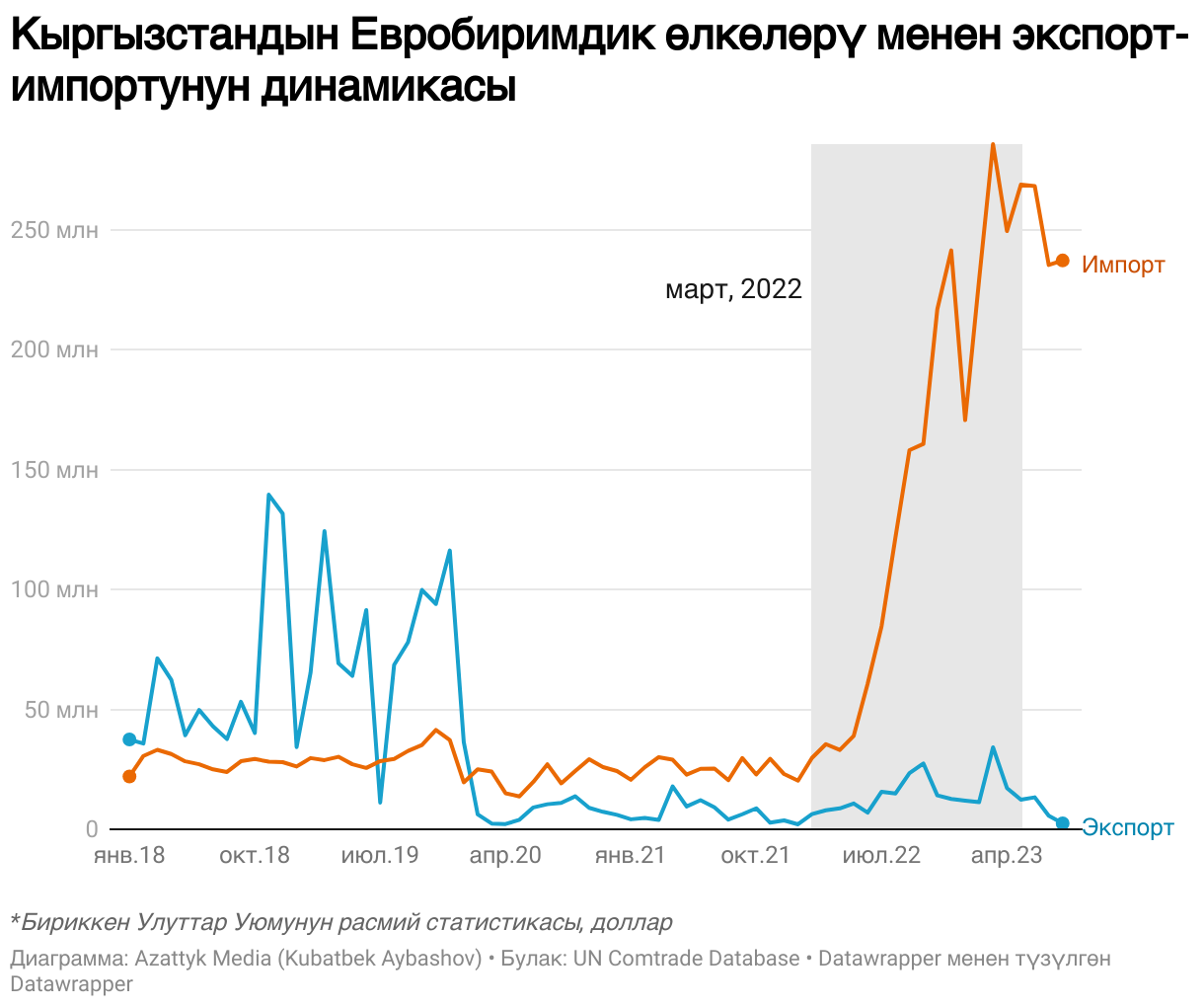 Кыргызстандын Евробиримдик өлкөлөрү менен экспорт-импортунун динамикасы