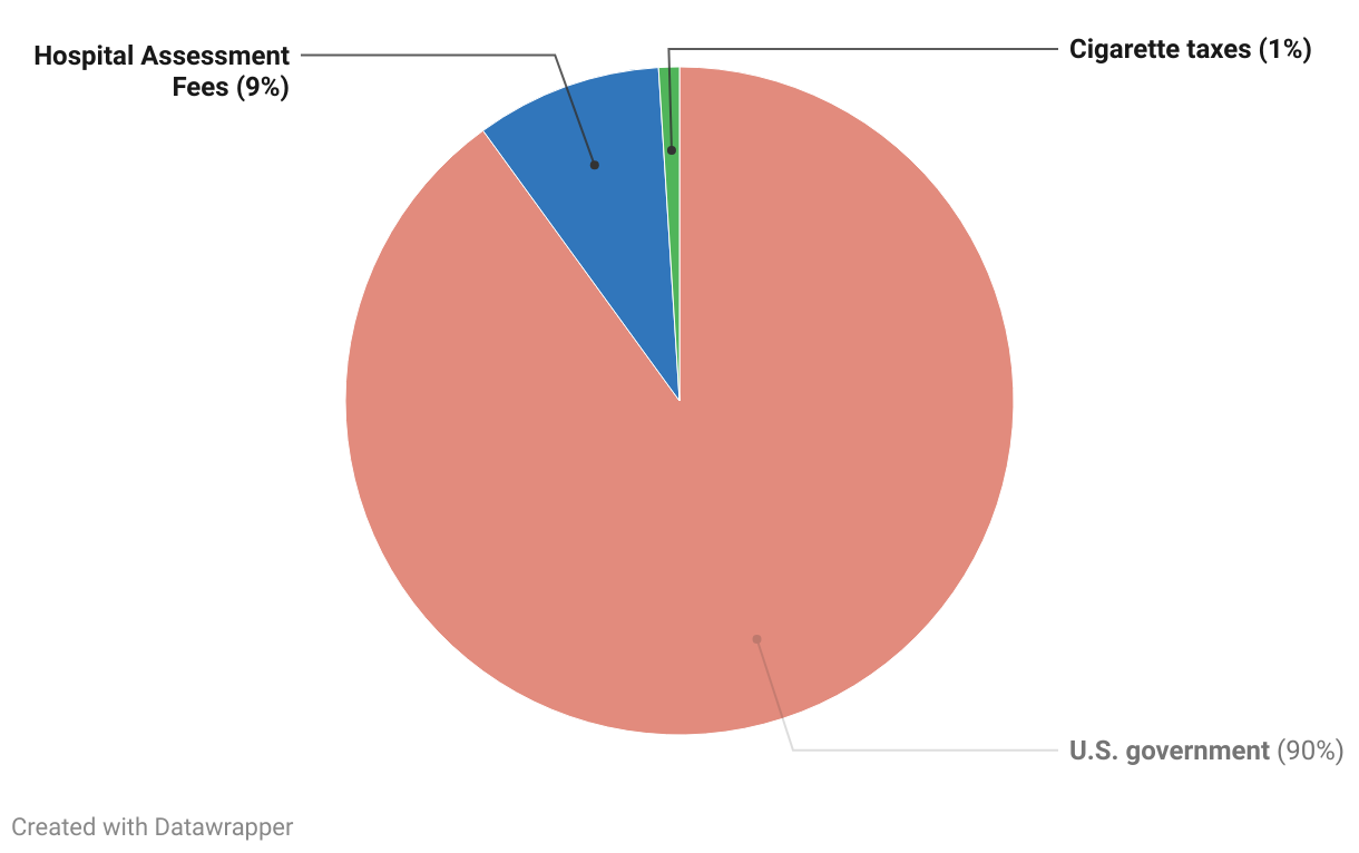 A pie chart splits up the sources of funding for Indiana's HIP program. 90 percent is covered by the U.S. government. Hospital Assessment Fees cover 9 percent and money generated by Indiana's cigarette tax cover the last 1 percent.