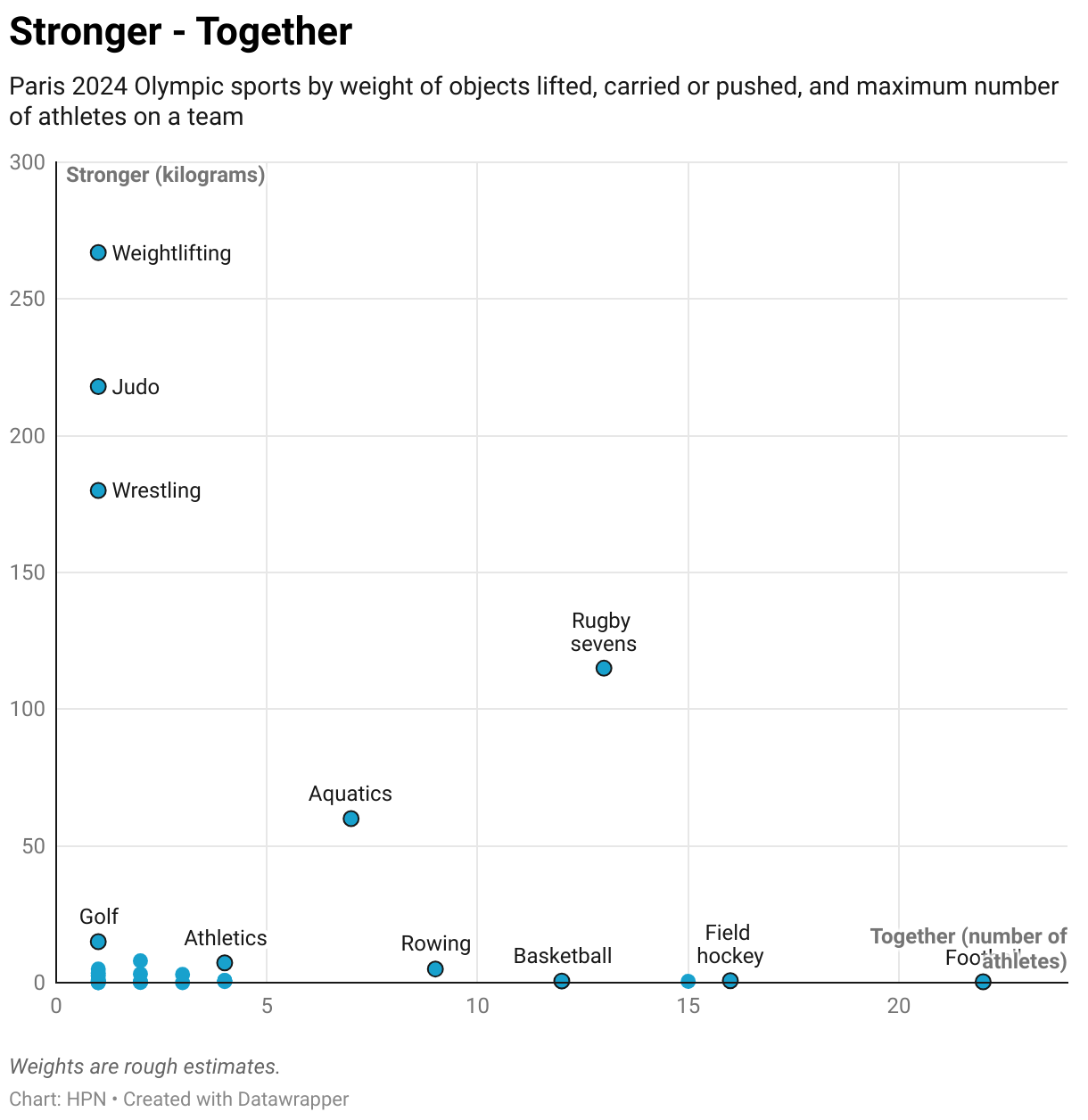 Paris 2024 Olympic sports by weight of objects lifted, carried or pushed, and maximum number of athletes on a team