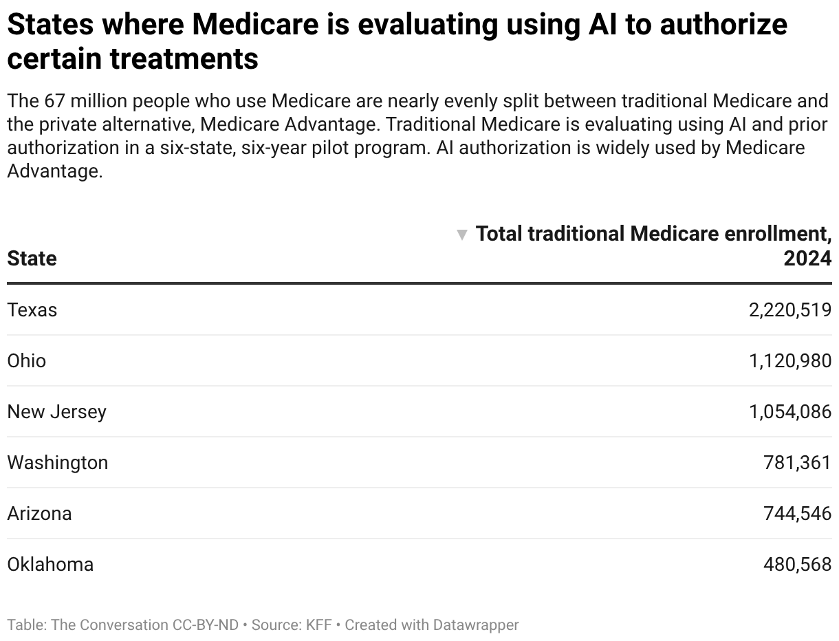 The 67 million people who use Medicare are nearly evenly split between traditional Medicare and the private alternative, Medicare Advantage. Traditional Medicare is evaluating using AI and prior authorization in a six-state, six-year pilot program. AI authorization is widely used by Medicare Advantage.