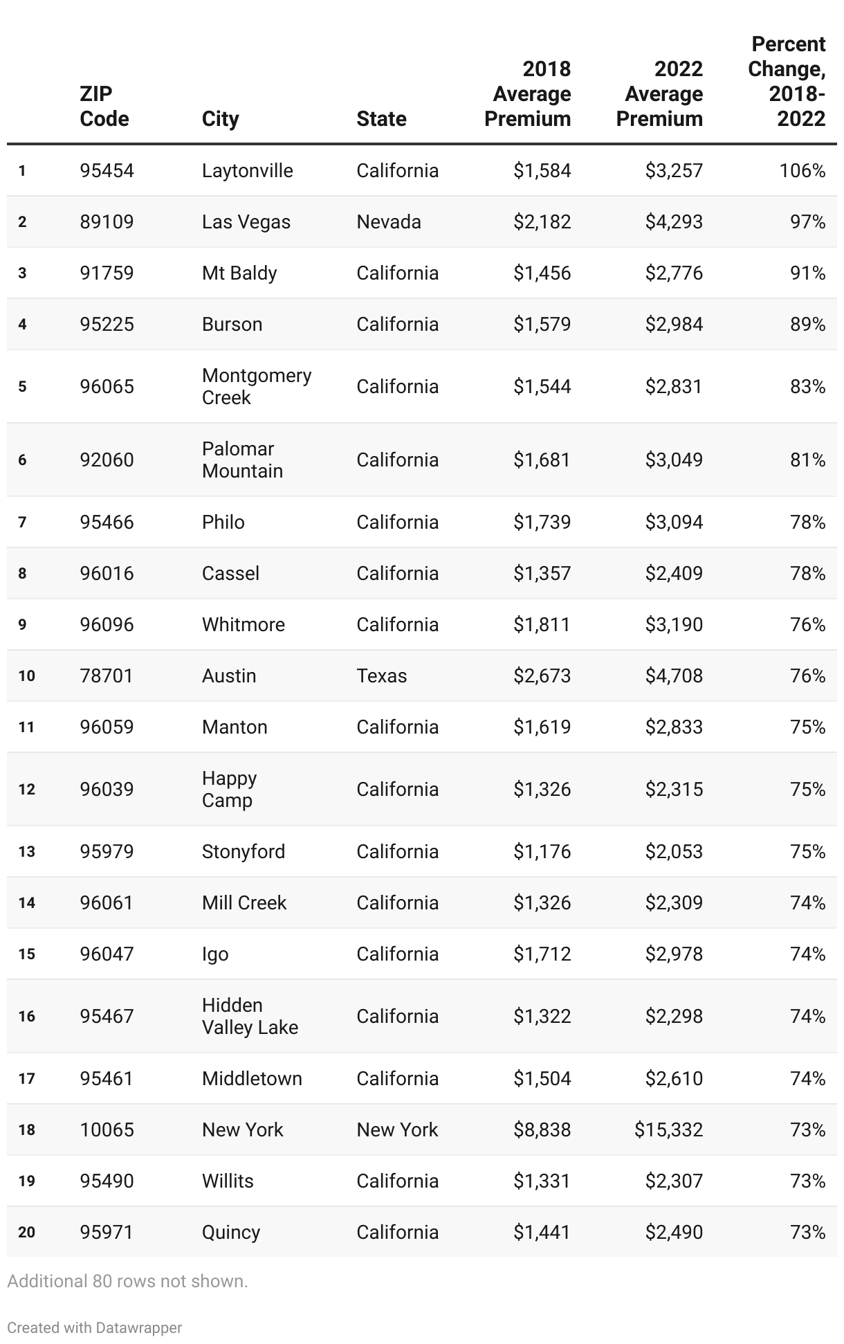 This table shows the 100 ZIP codes with the largest growth in average premiums.