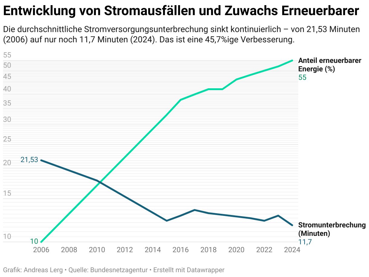 Die durchschnittliche Stromversorgungsunterbrechung sinkt kontinuierlich – von 21,53 Minuten (2006) auf nur noch 11,7 Minuten (2024). Das ist eine 45,7%ige Verbesserung.