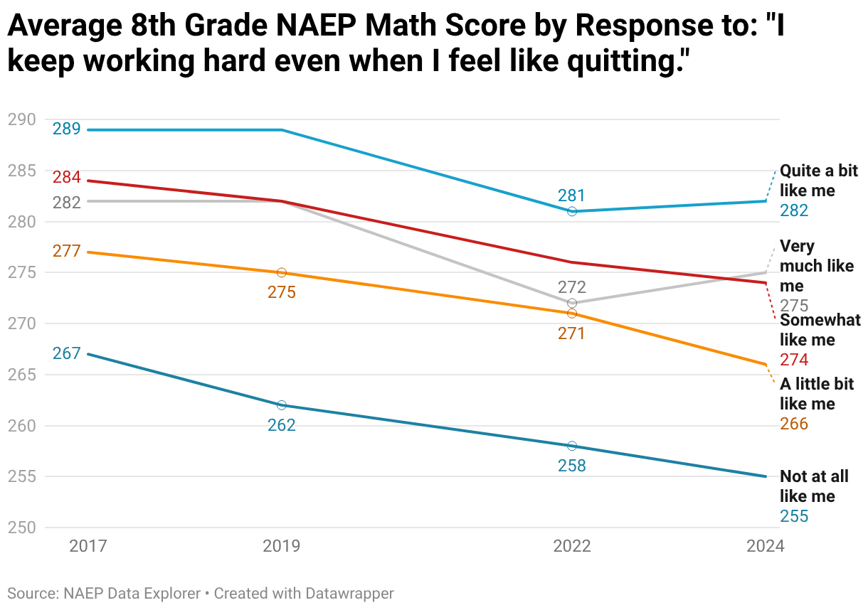 Average 8th Grade NAEP Math Score by Response to: "I keep working hard even when I feel like quitting."