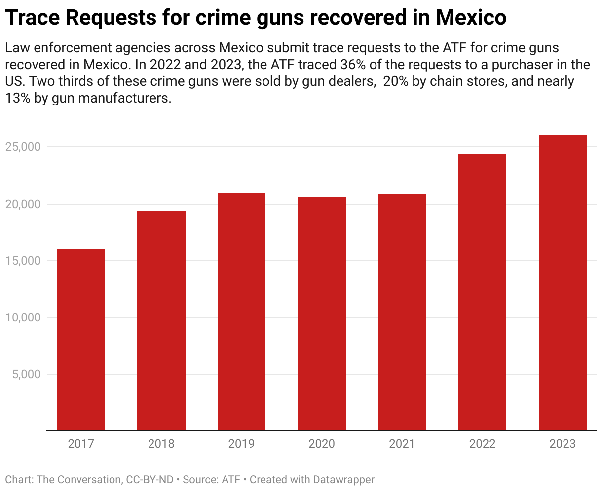 Law enforcement agencies across Mexico submit trace requests to the ATF for crime guns recovered in Mexico. In 2022 and 2023, the ATF traced 36% of the requests to a purchaser in the US. Two thirds of these crime guns were sold by gun dealers, 20% by chain stores, and nearly 13% by gun manufacturers.