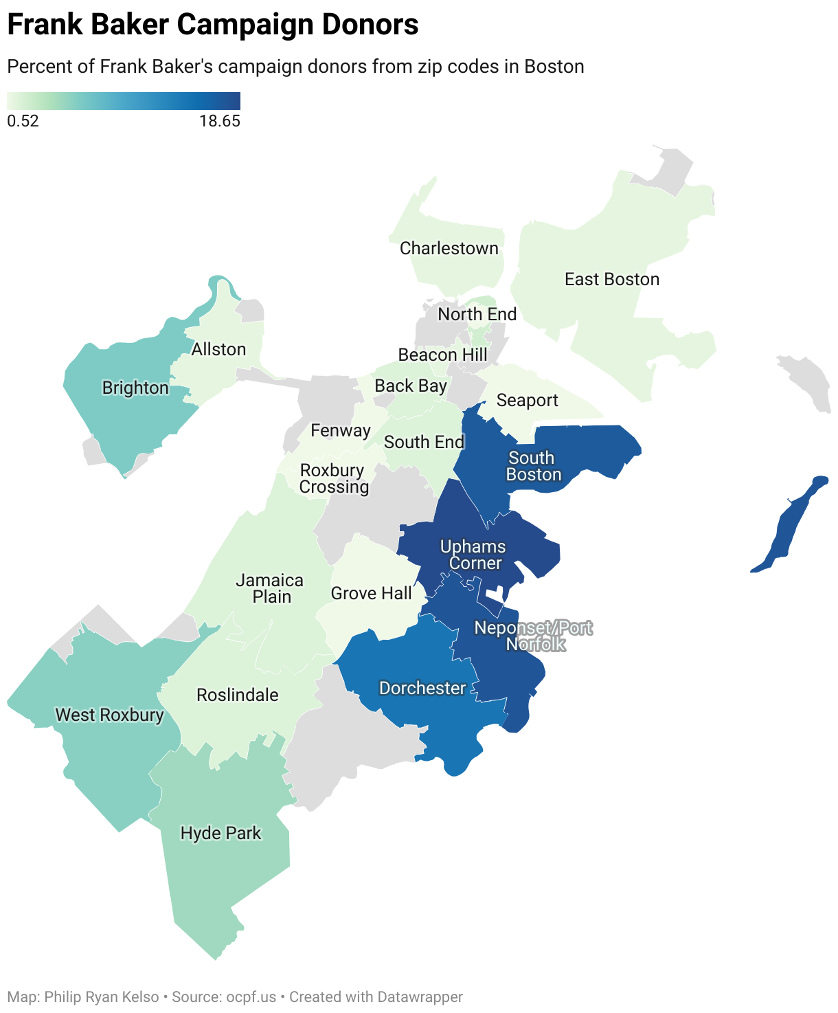Percent of Frank Baker's campaign donors from zip codes in Boston