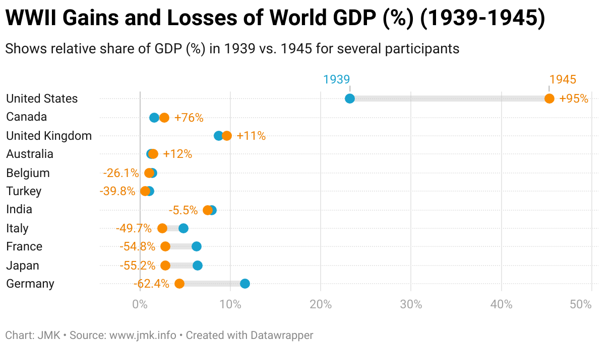 Shows relative share of GDP (%) in 1939 vs. 1945 for several participants