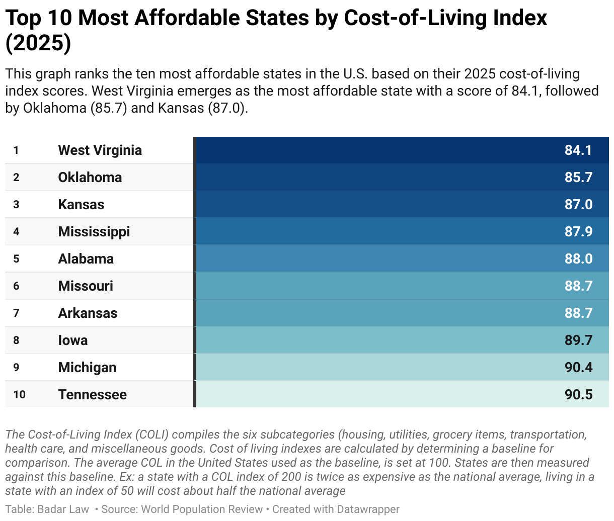 Top 10 Most Affordable States by Cost-of-Living Index (2025)