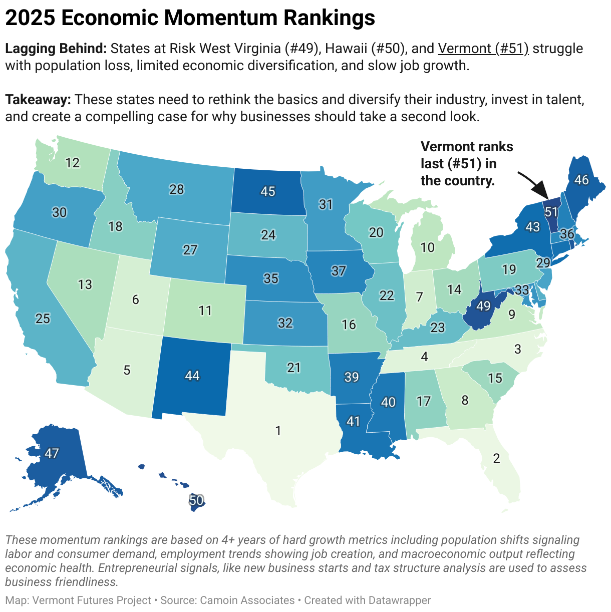 West Virginia (#49), Hawaii (#50), and Vermont (#51) struggle with population loss, limited economic diversification, and slow job growth.