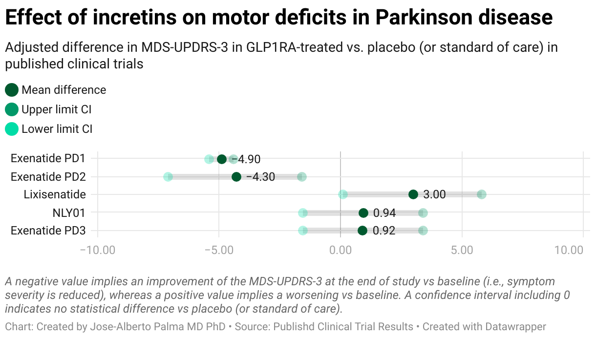 Adjusted difference in MDS-UPDRS-3 in GLP1RA-treated vs. placebo (or standard of care) in published clinical trials