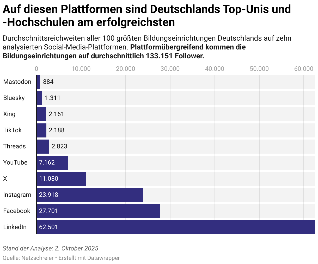 Durchschnittsreichweiten aller 100 größten Bildungseinrichtungen Deutschlands auf zehn analysierten Social-Media-Plattformen. Plattformübergreifend kommen die Bildungseinrichtungen auf durchschnittlich 133.151 Follower.