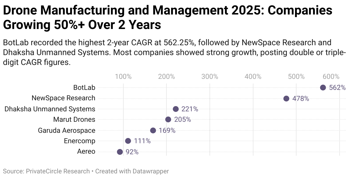 BotLab recorded the highest 2-year CAGR at 562.25%, followed by NewSpace Research and Dhaksha Unmanned Systems. Most companies showed strong growth, posting double or triple-digit CAGR figures.