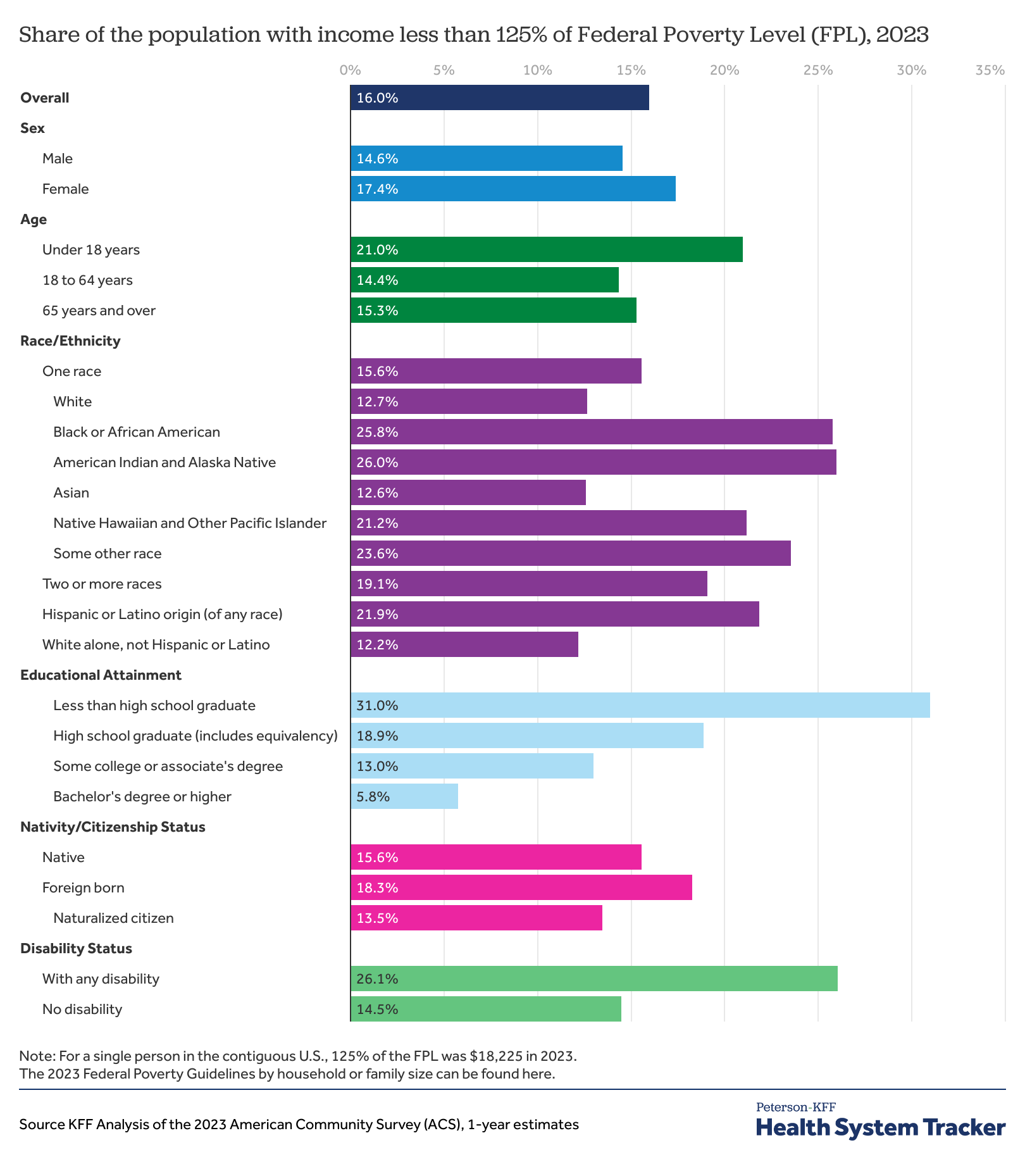 Share of the population with income less than 125% of Federal Poverty Level (FPL), 2023, for many demographic groups including sex, age, race, education, nativity, and disability status.