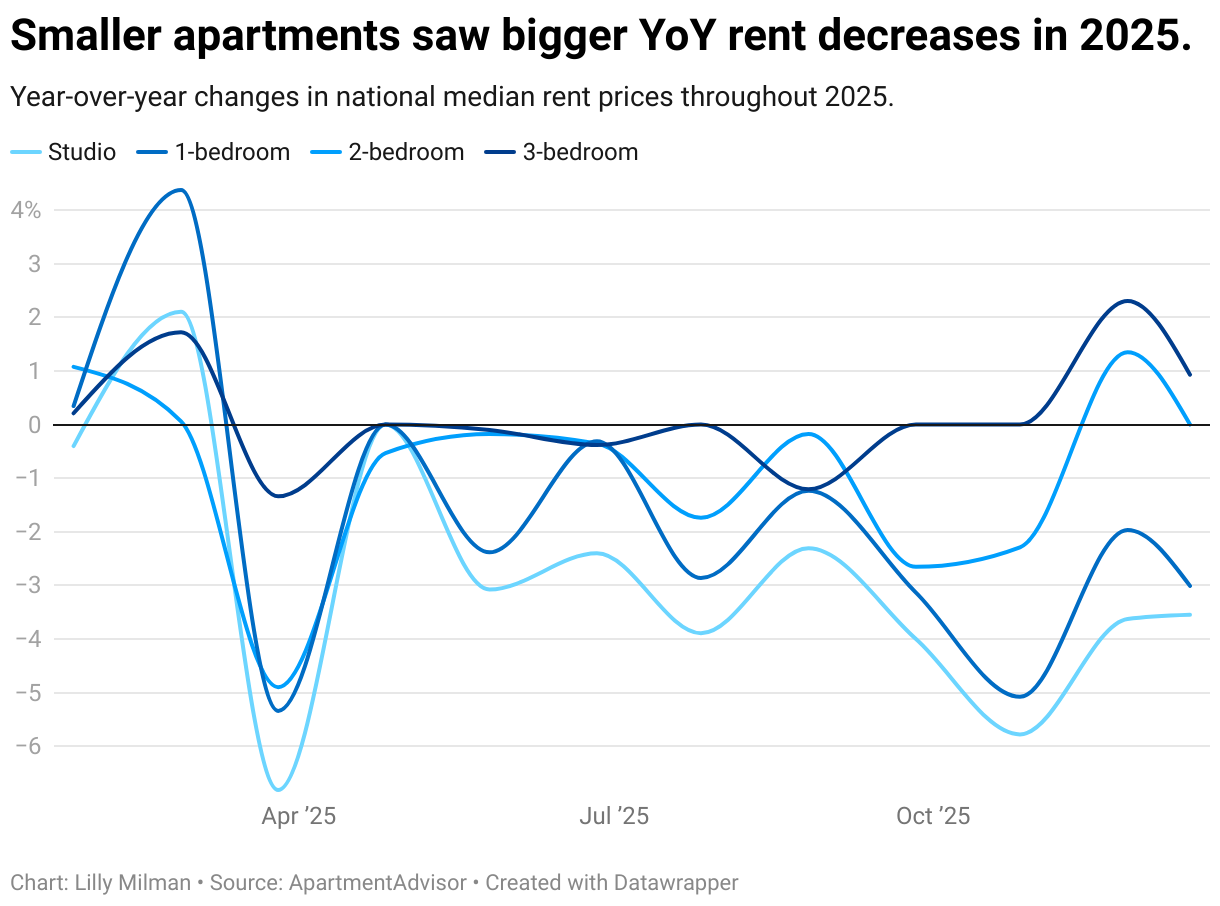 Year-over-year changes in national median rent prices throughout 2025.