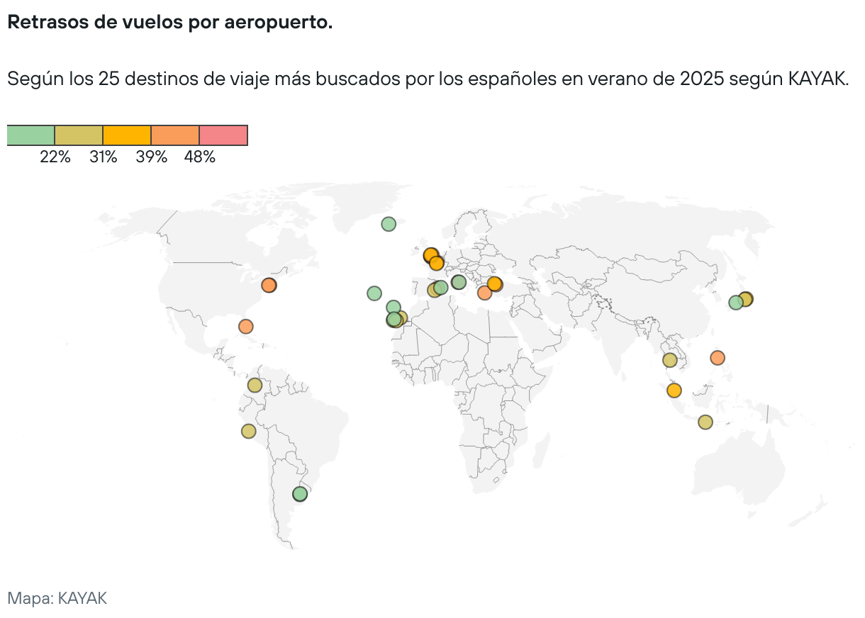 Retrasos de vuelos por aeropuerto.Según los 25 destinos de viaje más buscados por los españoles en verano de 2025 según KAYAK.
