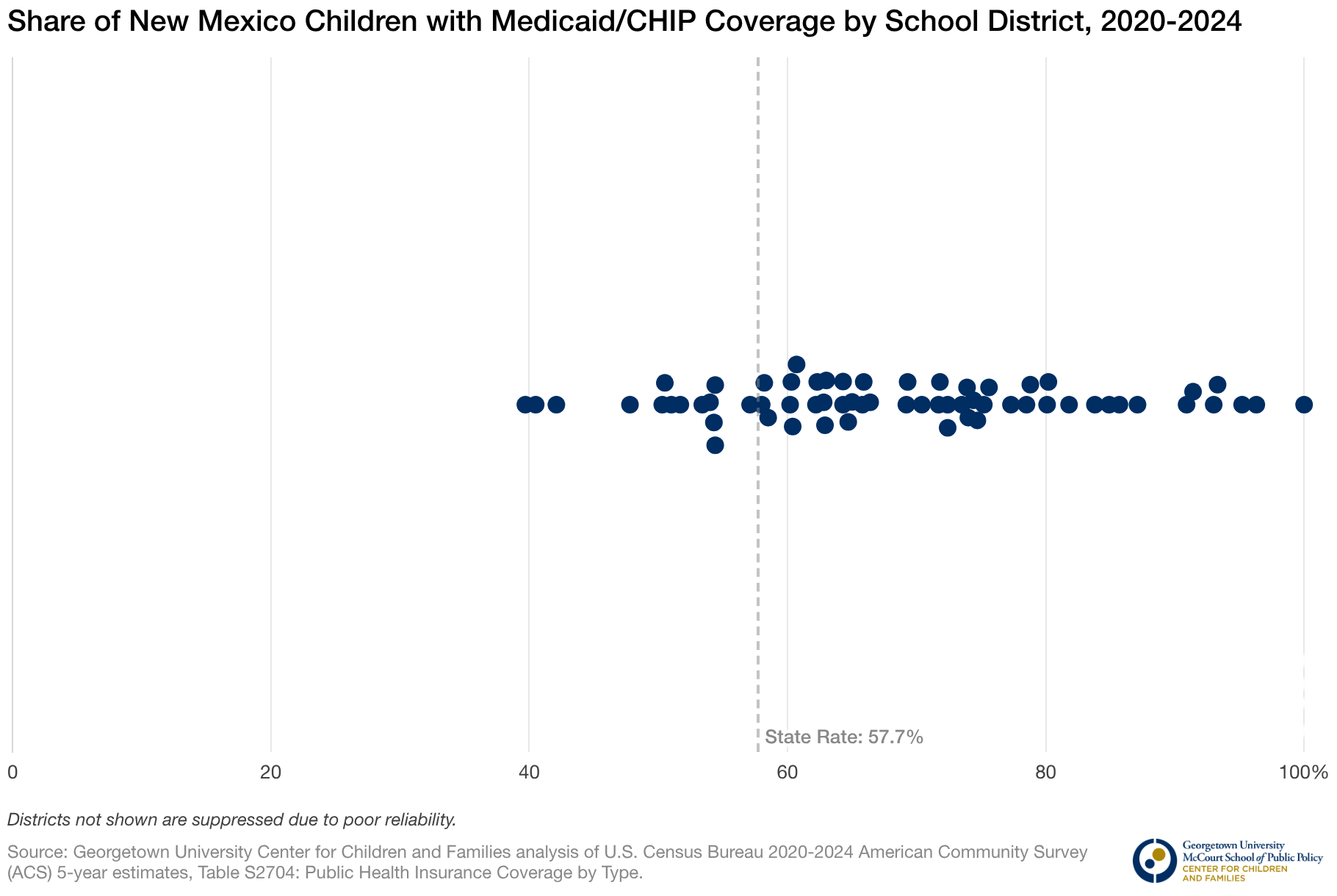 Share of New Mexico Children with Medicaid/CHIP Coverage by School District, 2020-2024