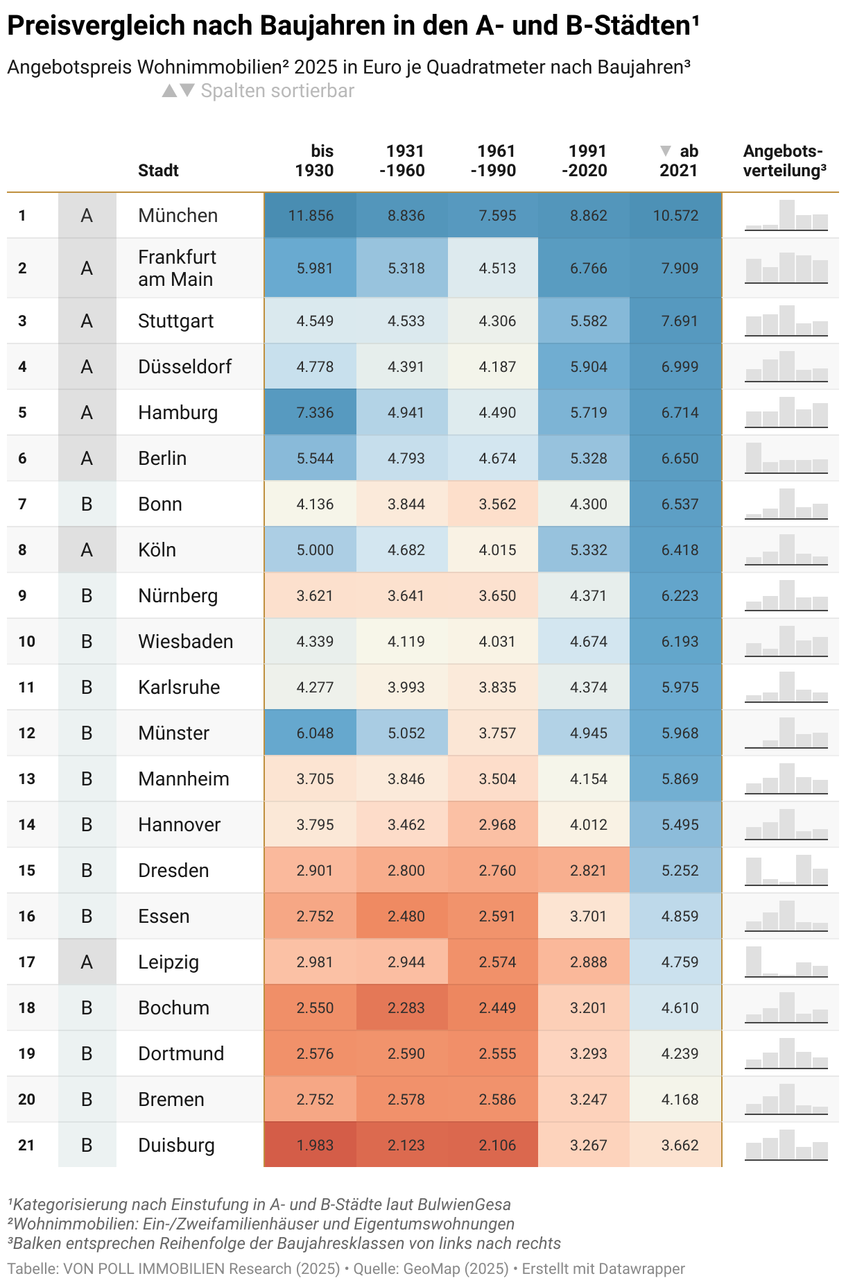 Angebotspreis Wohnimmobilien² 2025 in Euro je Quadratmeter nach Baujahren³ ▲▼ Spalten sortierbar