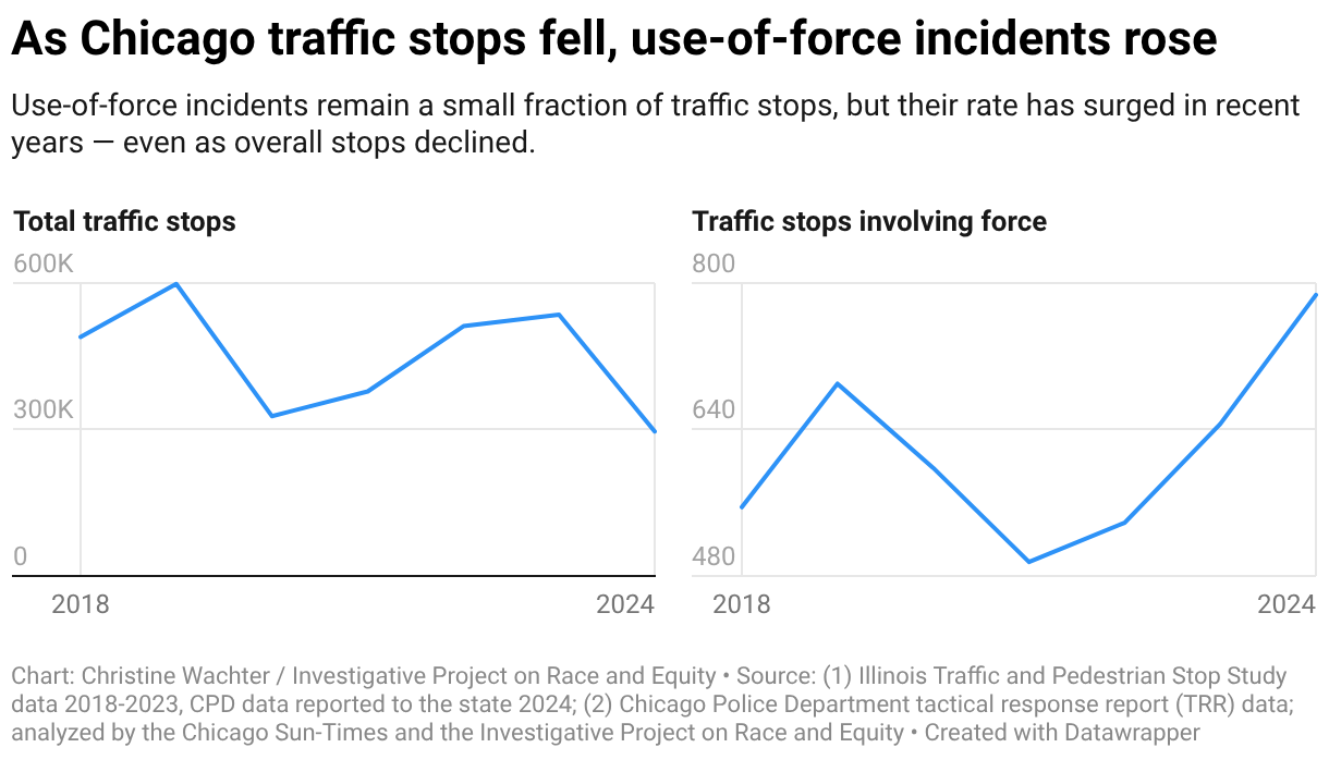 Use-of-force incidents remain a small fraction of traffic stops, but their rate has surged in recent years — even as overall stops declined.