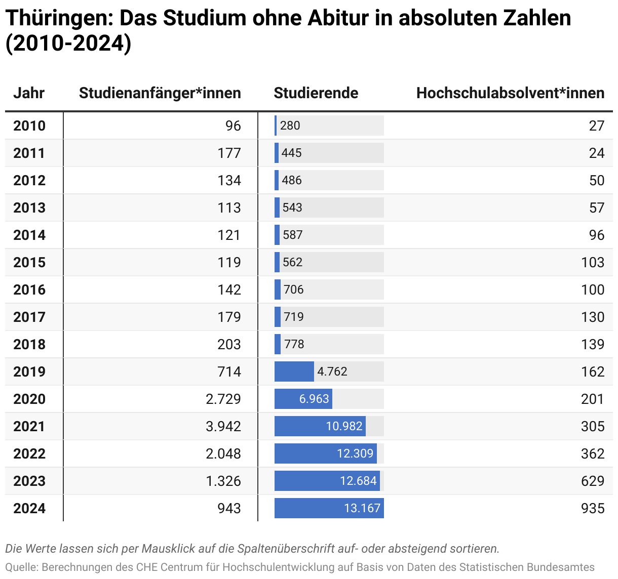 Thüringen: Das Studium ohne Abitur in absoluten Zahlen (2010-2024)