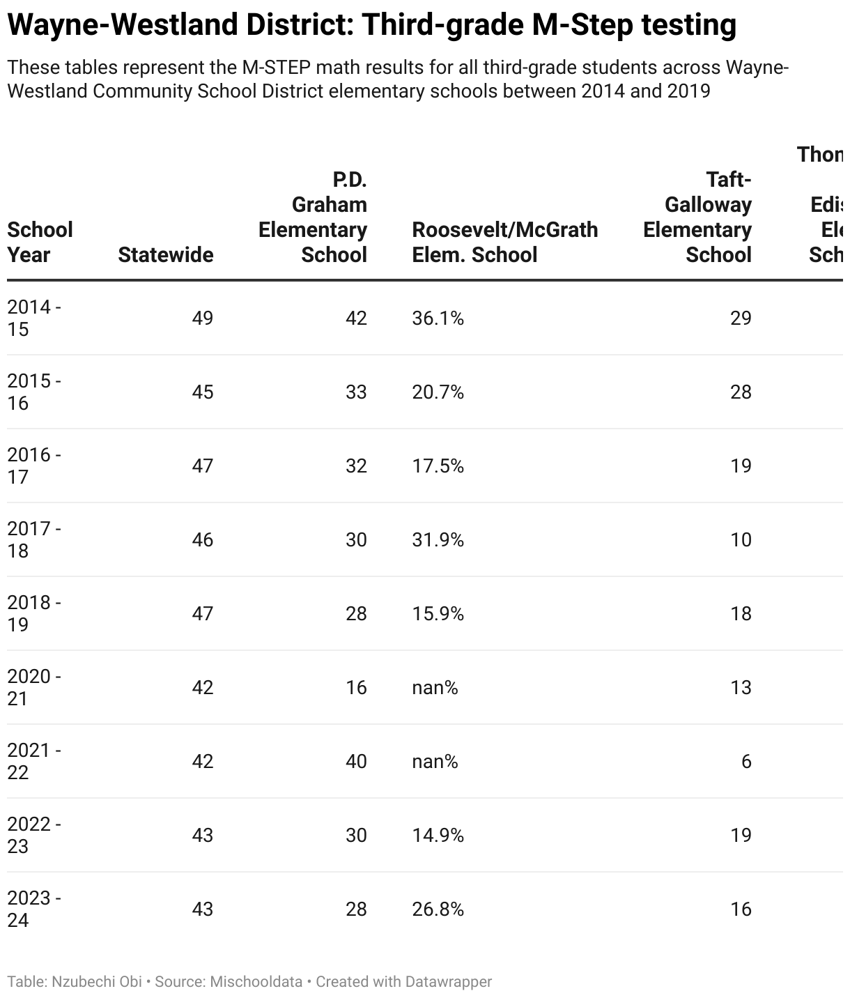 These tables represent the M-STEP math results for all third-grade students across Wayne-Westland Community School District elementary schools between 2014 and 2019