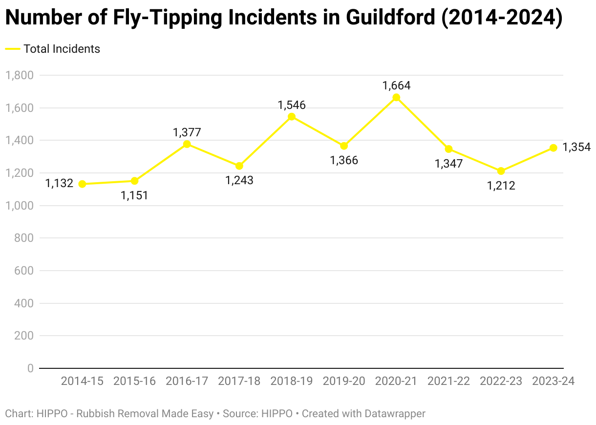 A chart displaying the total number of fly-tipping incidents in Guildford for the years reported by the government. 2014-15: 1132. 2015-16: 1151. 2016-17: 1377. 2017-18: 1243. 2018-19: 1546. 2019-20: 1366. 2020-21: 1664. 2021-22: 1347. 2022-23: 1212. 2023-24: 1354.
