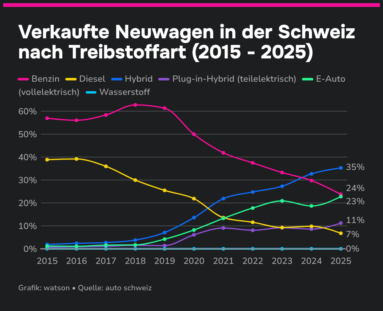 Verkaufte Neuwagen in der Schweiz nach Treibstoffart (2015 - 2025)