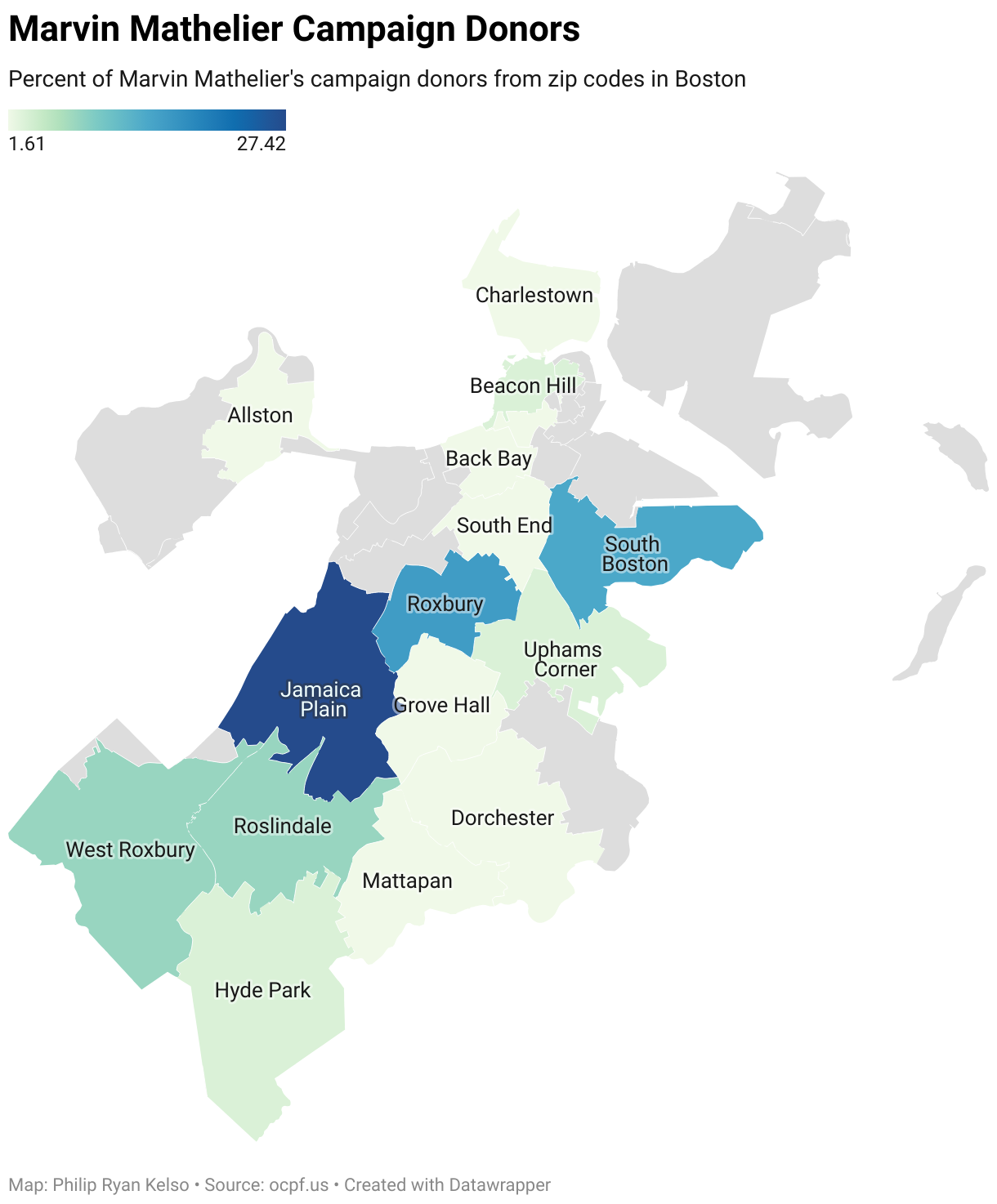 The map shows a heat map of the percent of campaign donations that came from each region of Boston for Julia Mejia. Jamaica Plain, Hyde Park, and Roslindale are the regions with the highest percentage.