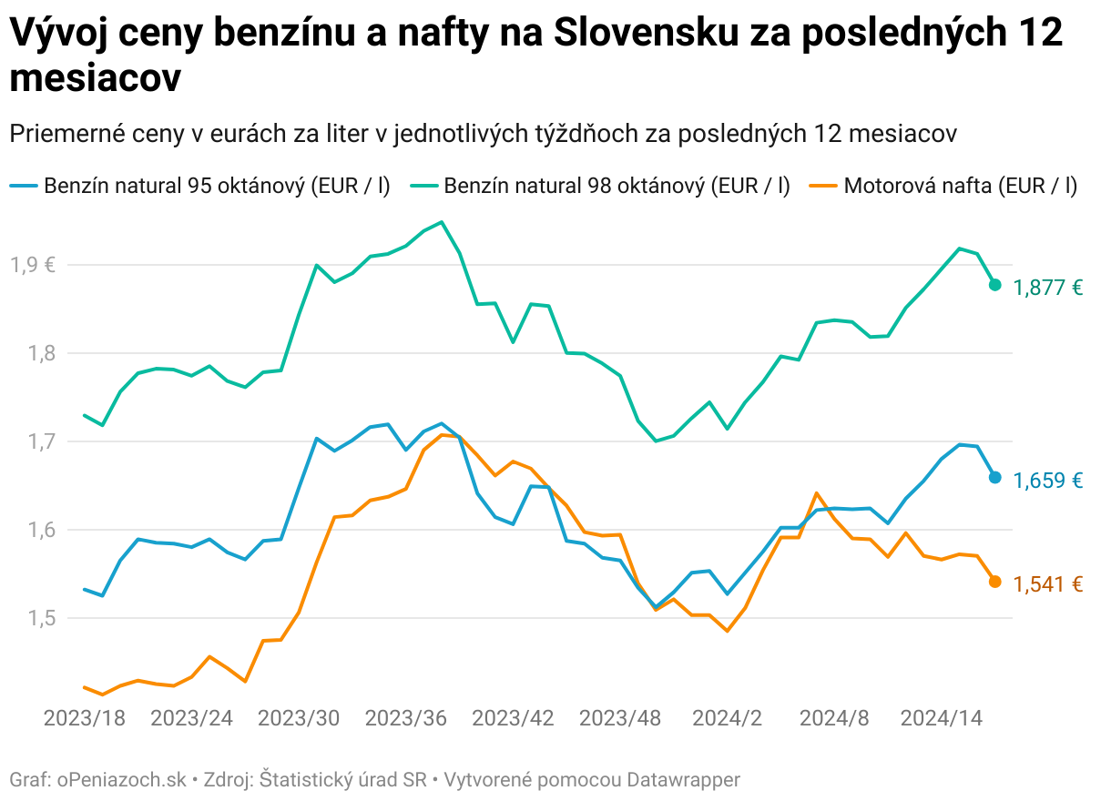 Priemerné ceny v eurách za liter v jednotlivých týždňoch za posledných 12 mesiacov