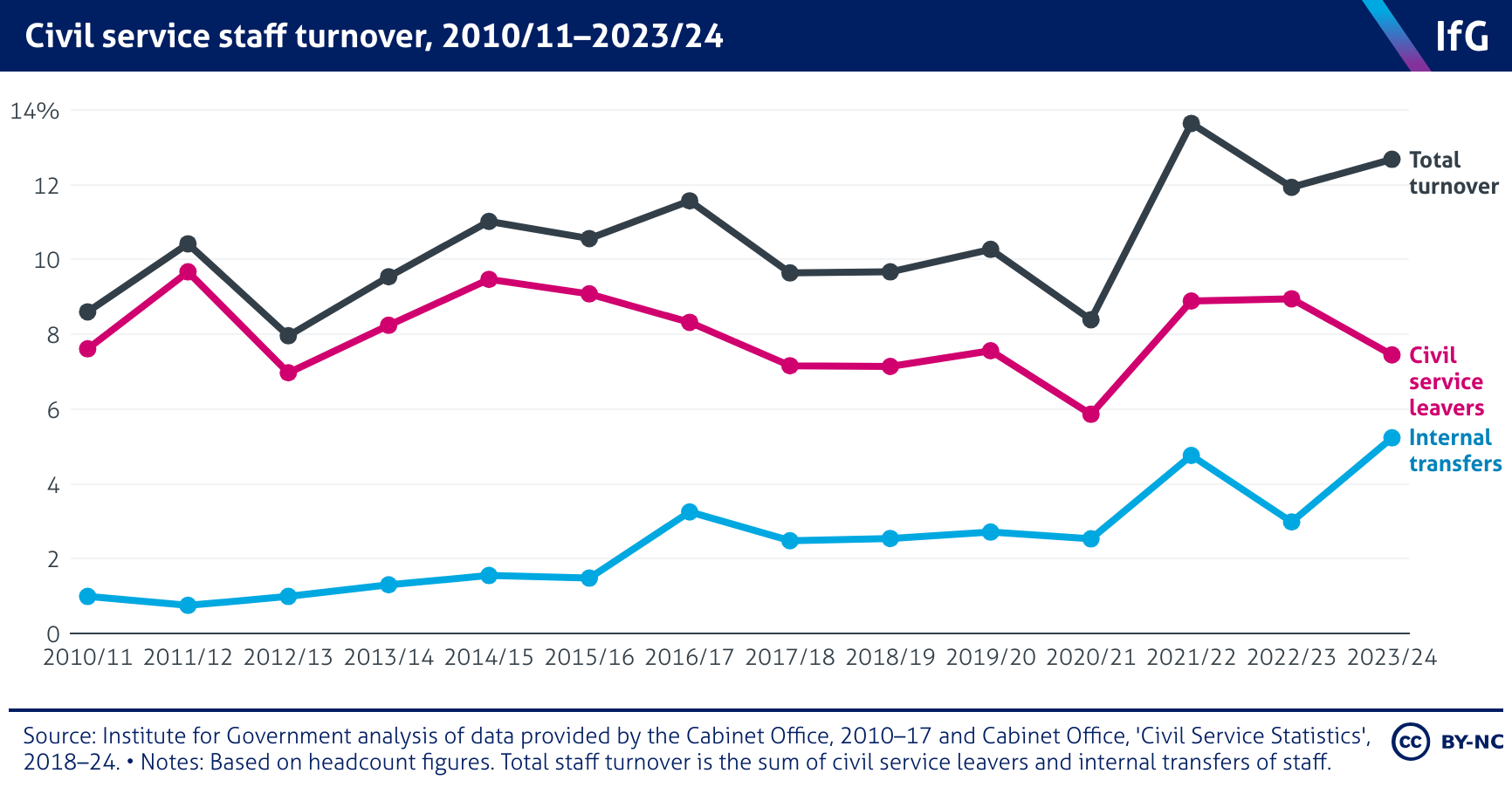 A line graph from the Institute for Government showing civil service staff turnover, 2010/11-2023/24, where total turnover has seen a slight uptick between 2022/23 and 2023/24, driven by internal transfers, whilst the share of civil service leavers decreased.