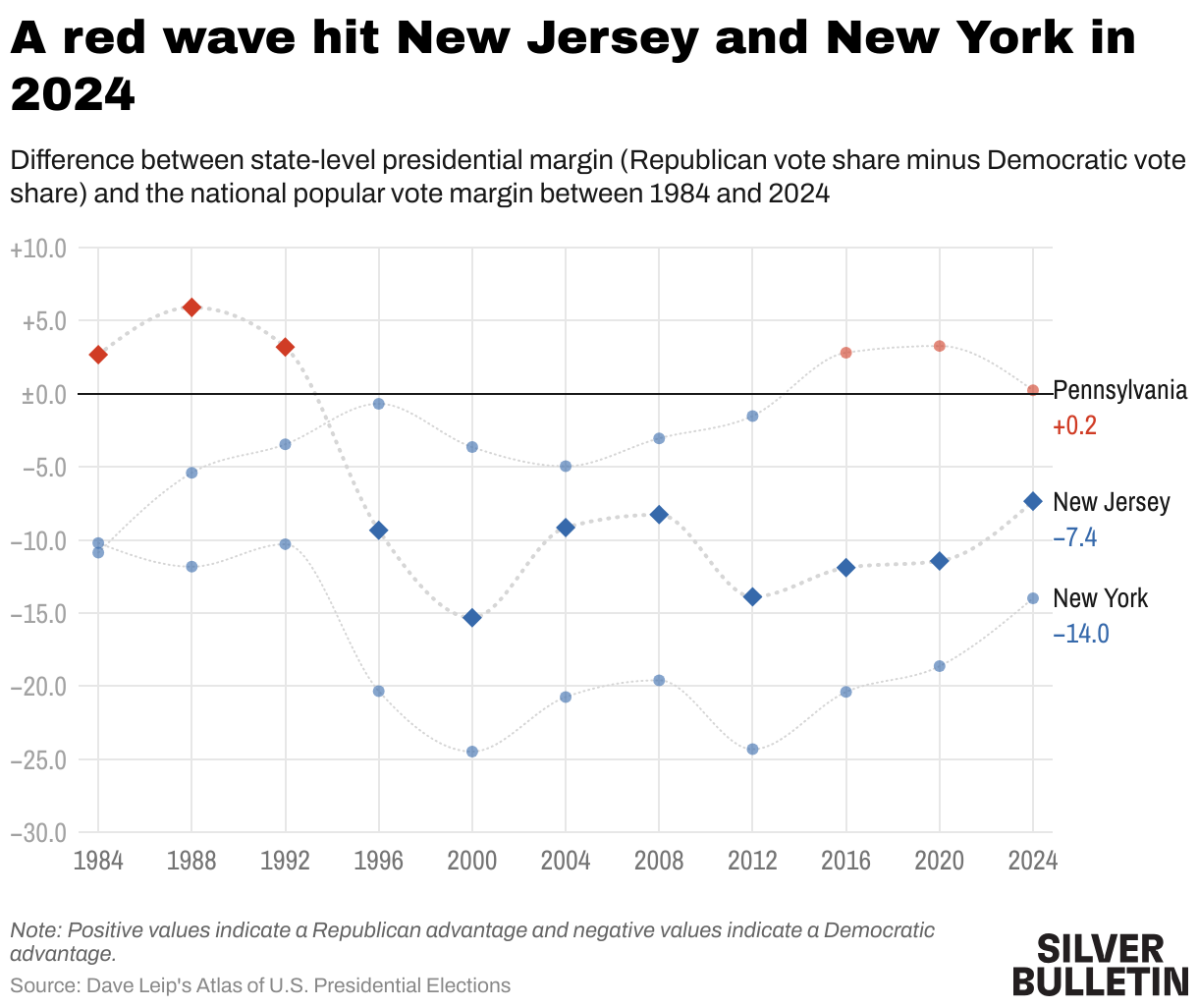 Difference between state-level presidential margin (Republican vote share minus Democratic vote share) and the national popular vote margin between 1984 and 2024