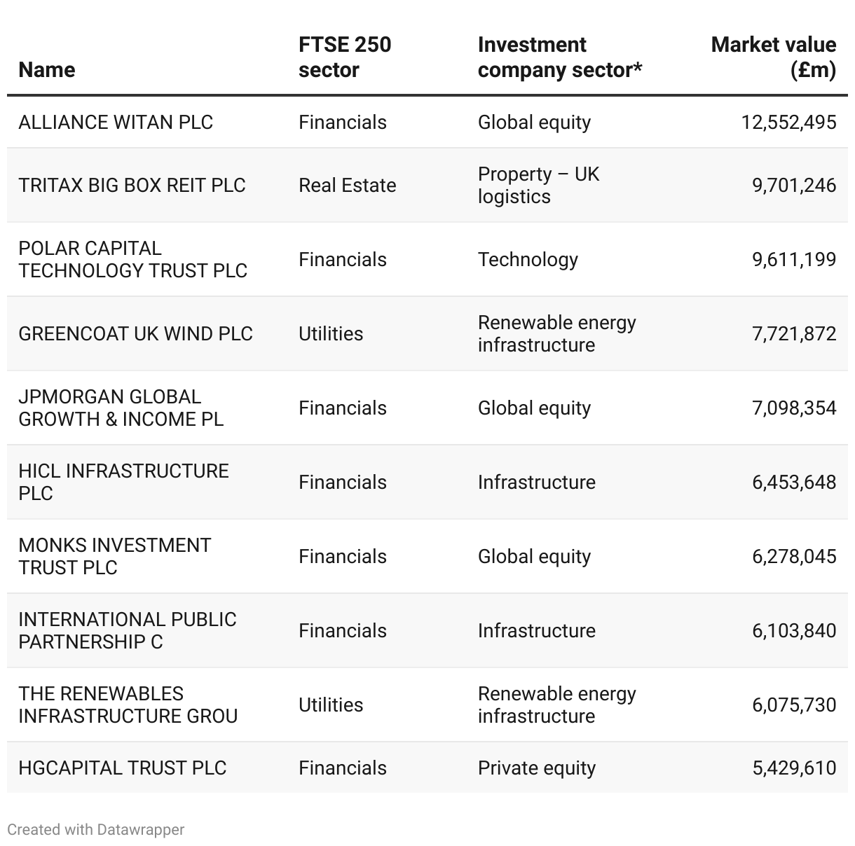 Largest investment trusts in the FTSE 250 index