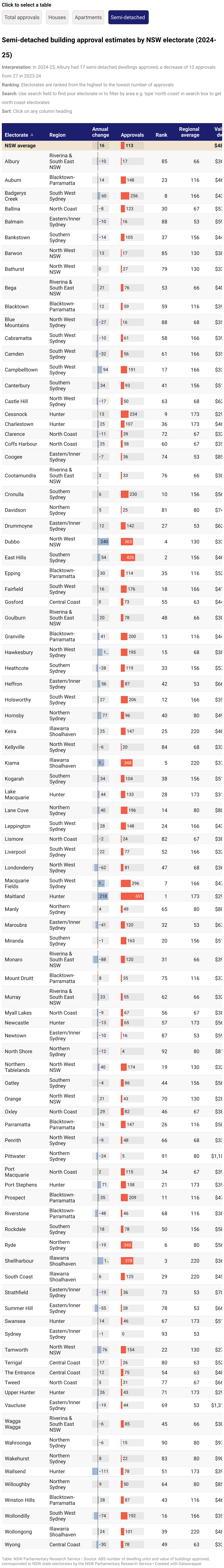 Semi-detached building approval estimates by NSW electorate (2024-25)