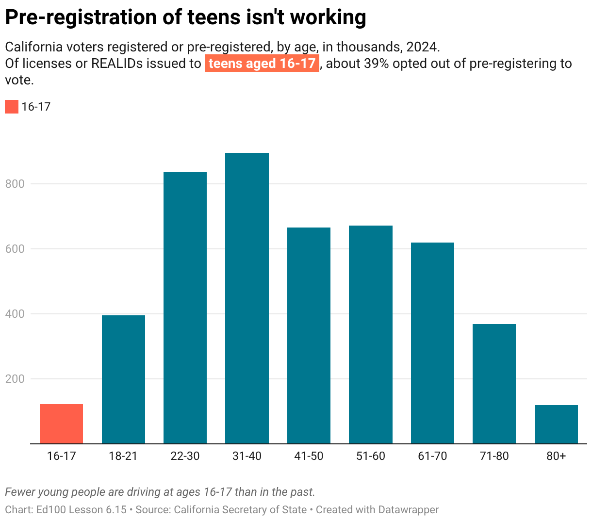 California voters registered or pre-registered, by age, in thousands, 2024.Of licenses or REALIDs issued to teens aged 16-17, about 39% opted out of pre-registering to vote.