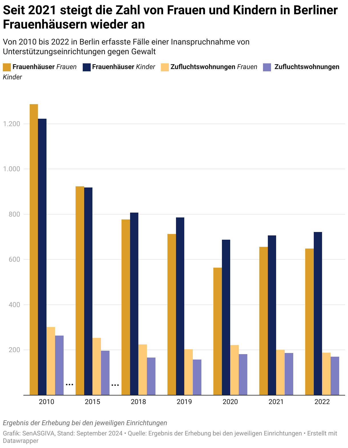 Die Inanspruchnahme von Frauenhäusern durch Frauen ist in den letzten 10 Jahren um über die Hälfte gesunken (2010 waren es noch 1.287 Frauen). Die Anzahl der Kinder ist zwar auch gesunken, jedoch nicht in gleichem Maß (2010: 1.222 Kinder, die mit ihren Müttern in Frauenhäusern waren). Es flüchten also insgesamt zwar weniger Frauen in ein Frauenhaus, im Schnitt hatten sie jedoch mehr Kinder dabei.