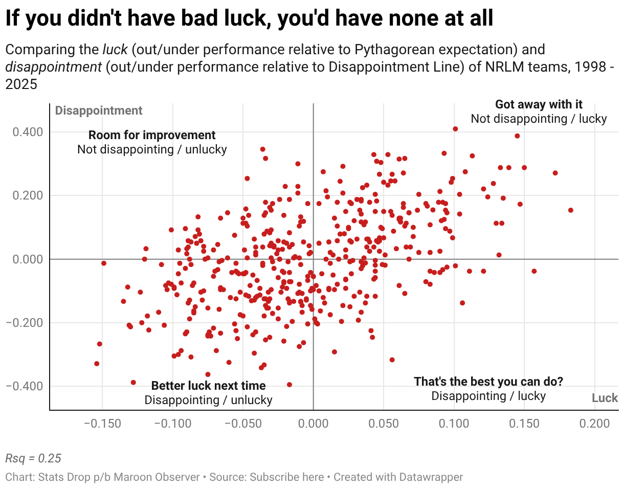 Comparing the luck (out/under performance relative to Pythagorean expectation) and disappointment (out/under performance relative to Disappointment Line) of NRLM teams, 1998 - 2025