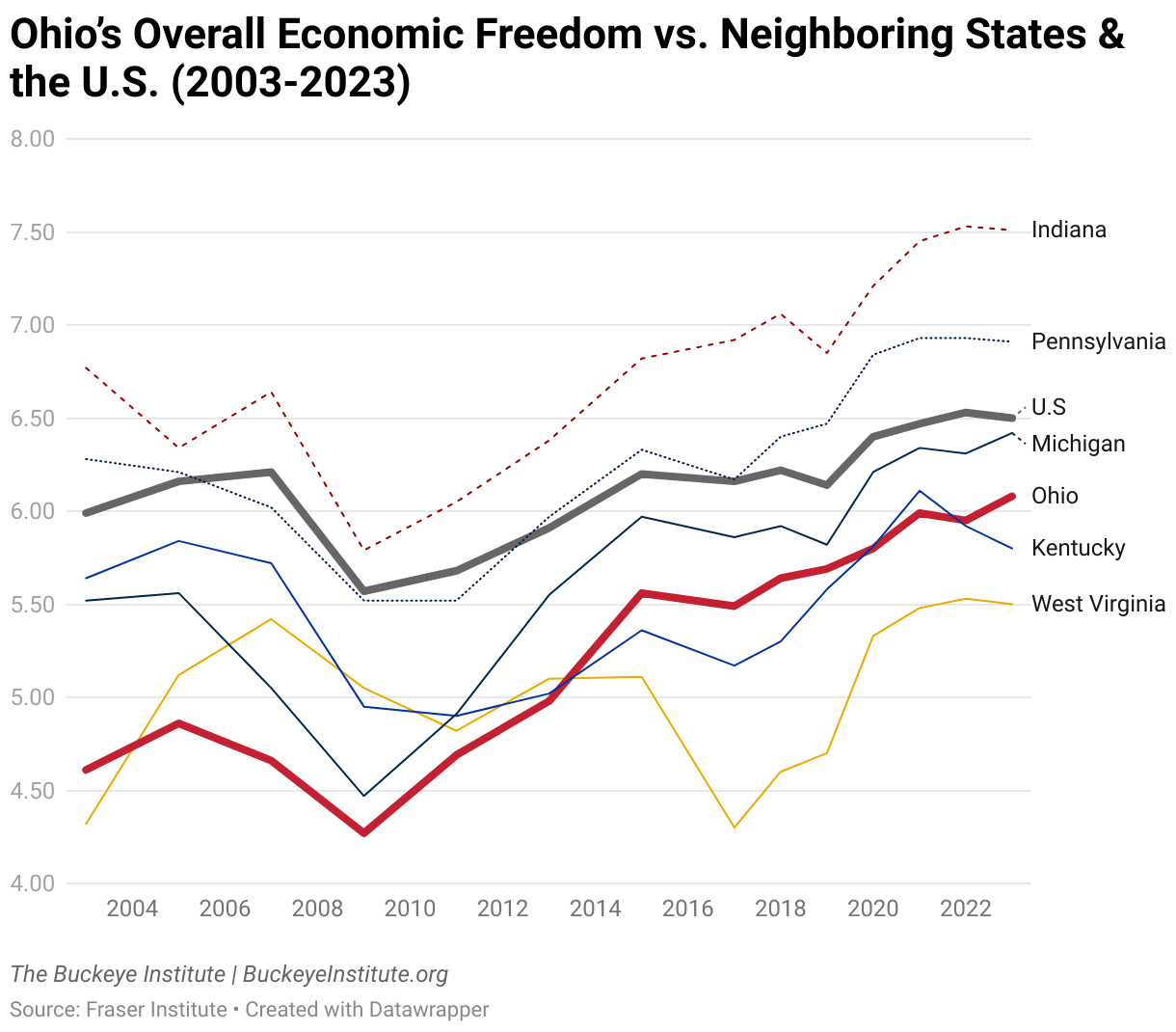 Ohio’s Overall Economic Freedom vs. Neighboring States & the U.S. (2003-2023)