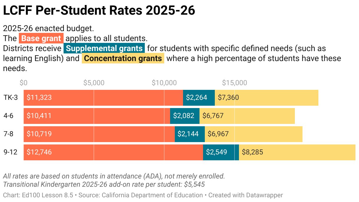 2025-26 enacted budget. The Base grant applies to all students.Districts receive Supplemental grants for students with specific defined needs (such as learning English) and Concentration grants where a high percentage of students have these needs.
