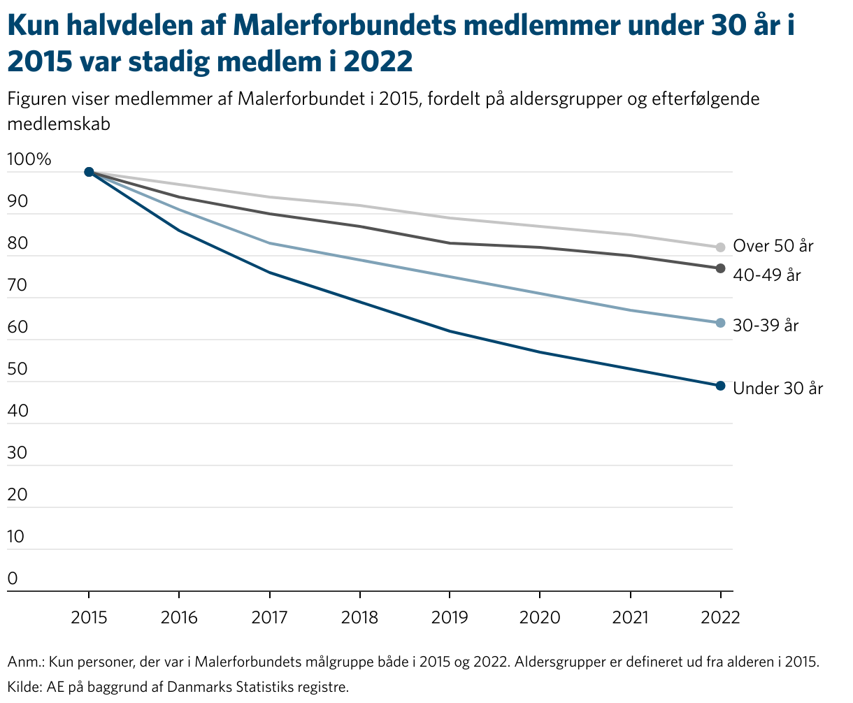 Figuren viser medlemmer af Malerforbundet i 2015, fordelt på aldersgrupper og efterfølgende medlemskab