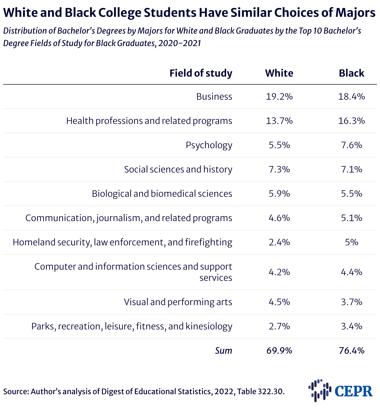 Distribution of Bachelor's Degrees by Majors for White and Black Graduates by the Top 10 Bachelor's Degree Fields of Study for Black Graduates, 2020-2021