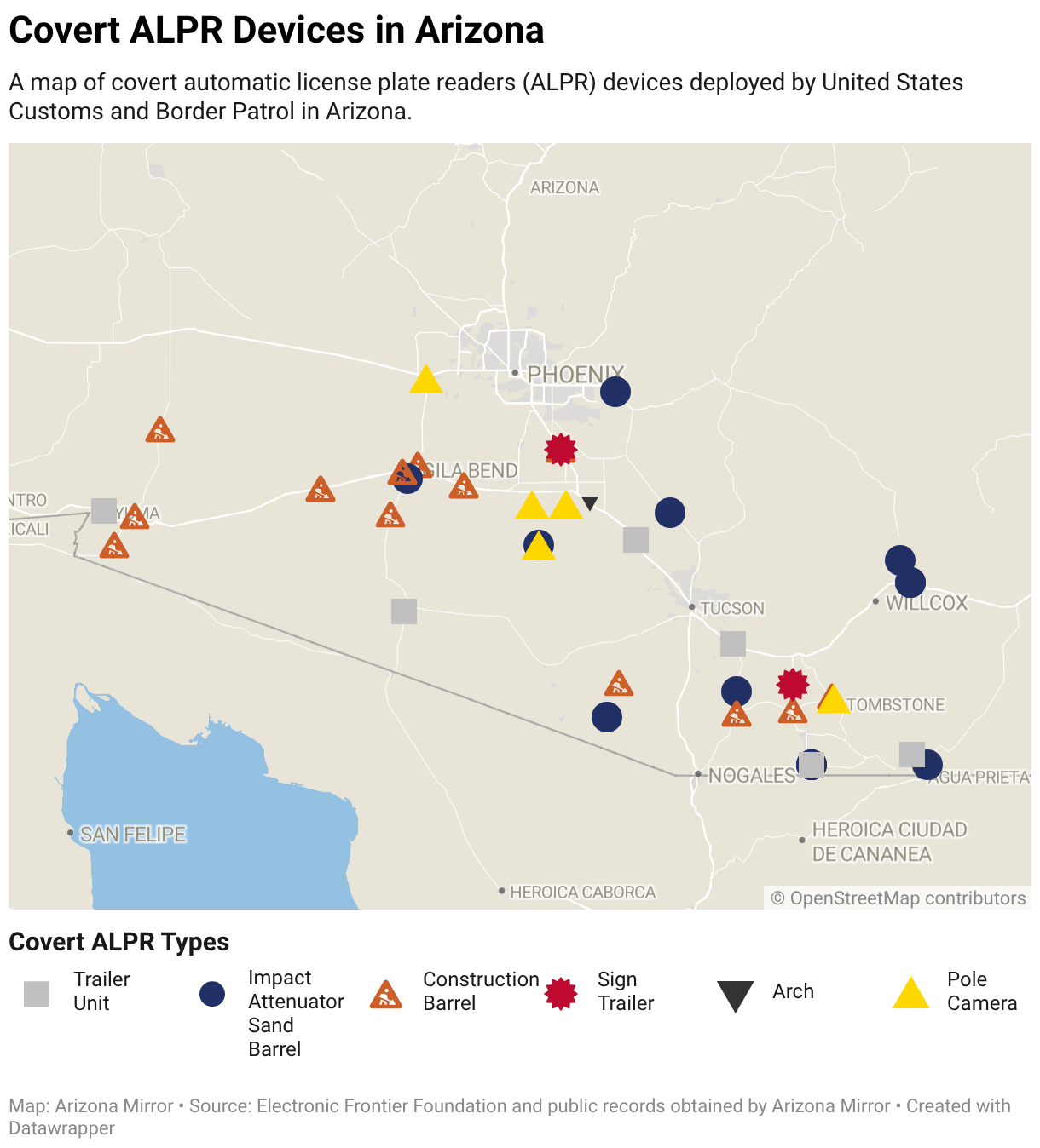 A map of covert automatic license plate readers (ALPR) devices deployed by United States Customs and Border Patrol in Arizona.