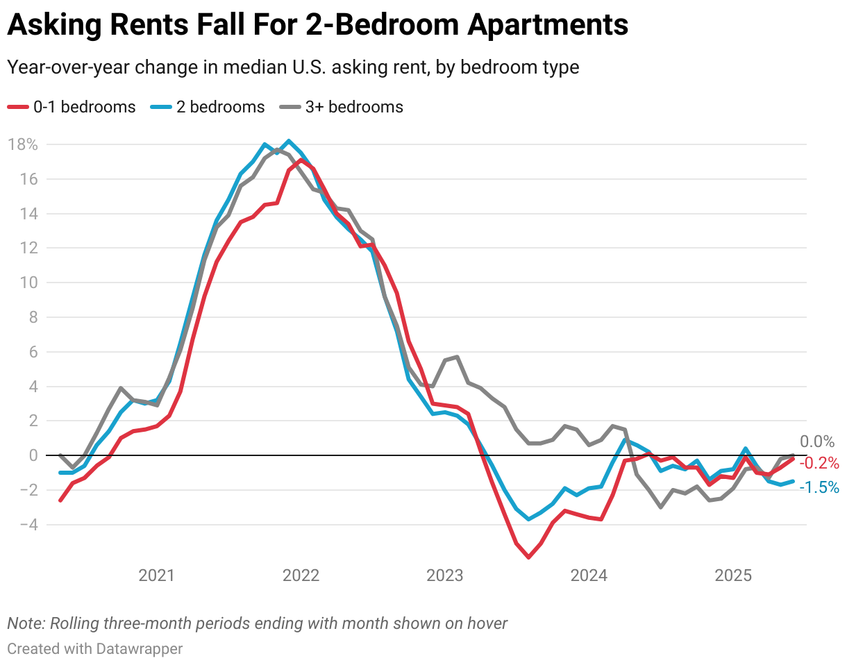 Year-over-year change in median U.S. asking rent, by bedroom type