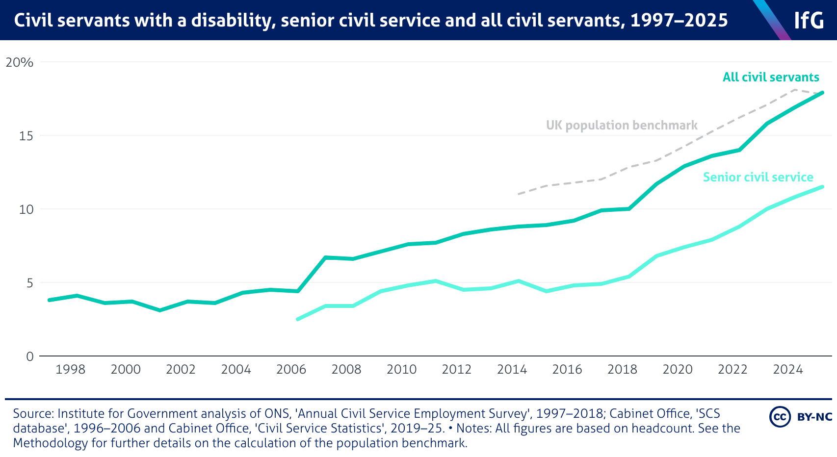 Civil servants with a disability, senior civil service and all civil servants, 1997–2025