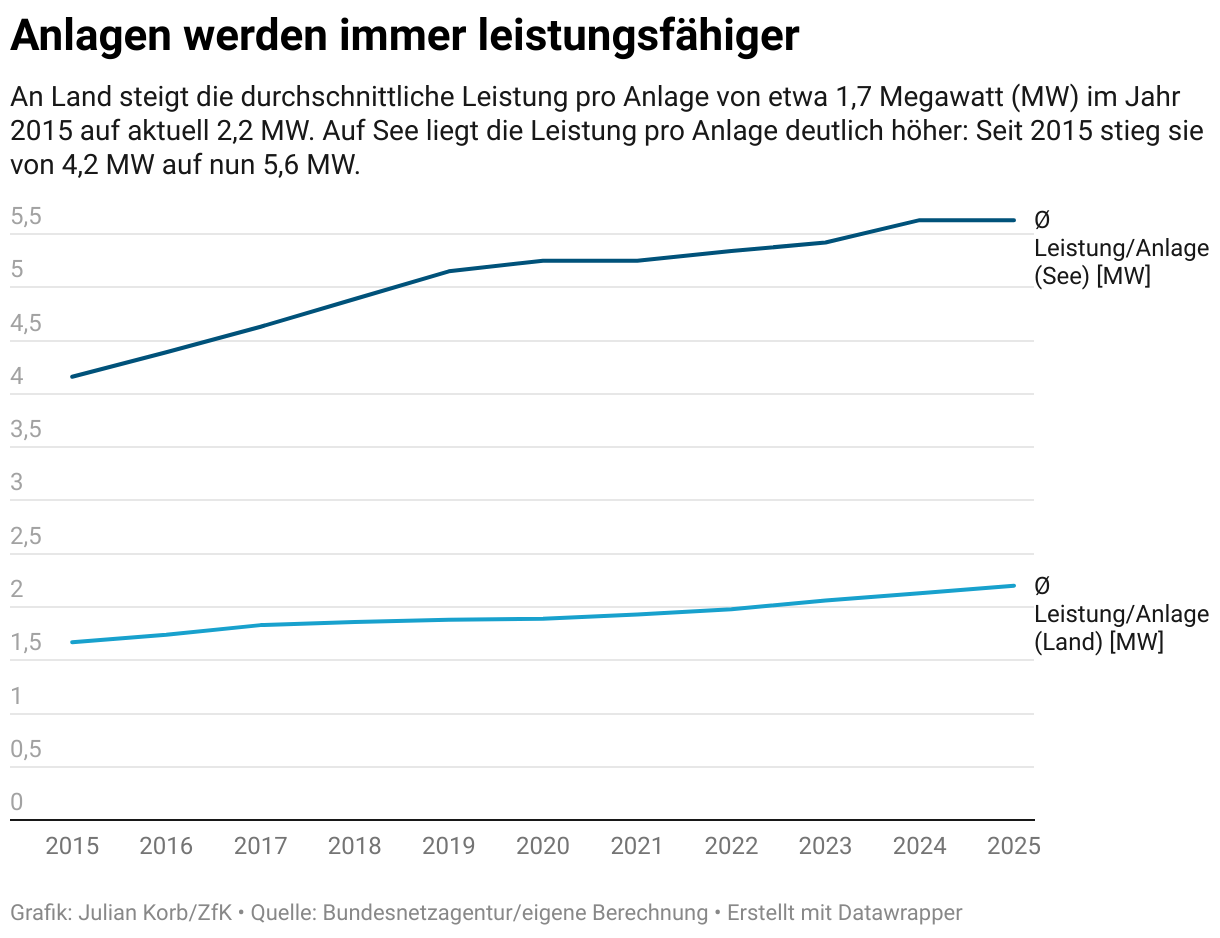 An Land steigt die durchschnittliche Leistung pro Anlage von etwa 1,7 Megawatt (MW) im Jahr 2015 auf aktuell 2,2 MW. Auf See liegt die Leistung pro Anlage deutlich höher: Seit 2015 stieg sie von 4,2 MW auf nun 5,6 MW.
